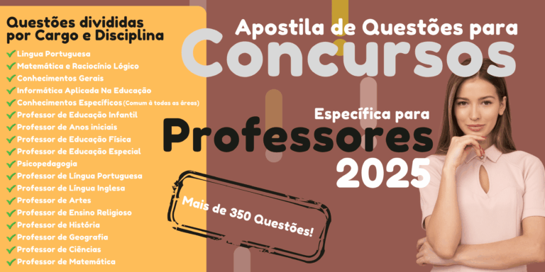 Se você é professor e sonha com a estabilidade de um cargo público, a preparação para concursos exige estratégia, dedicação e, principalmente, o material certo. Apresentamos a Apostila com 390 Questões de Concurso, um recurso indispensável para quem deseja se destacar nas provas de 2025 e conquistar a tão sonhada aprovação.